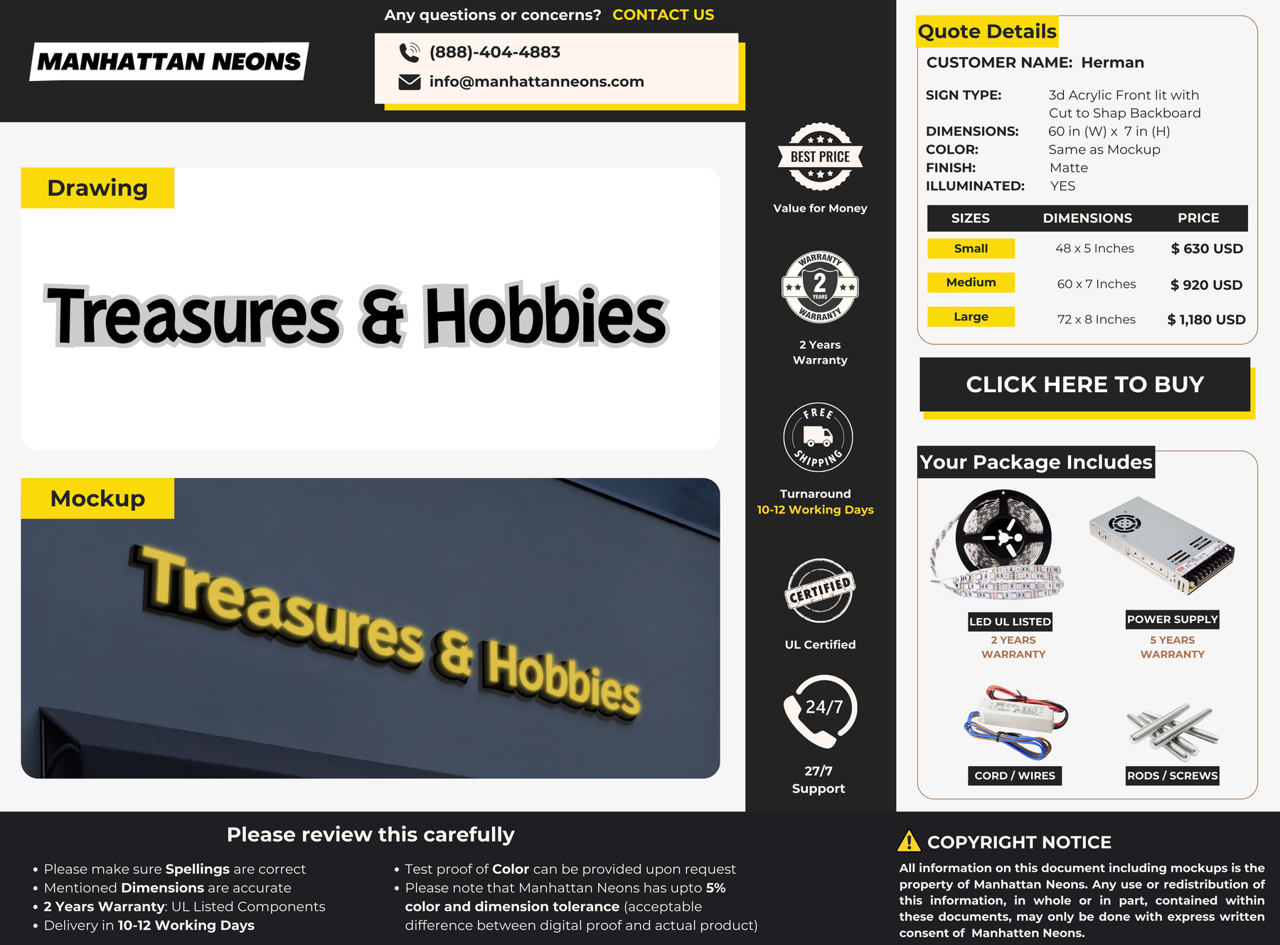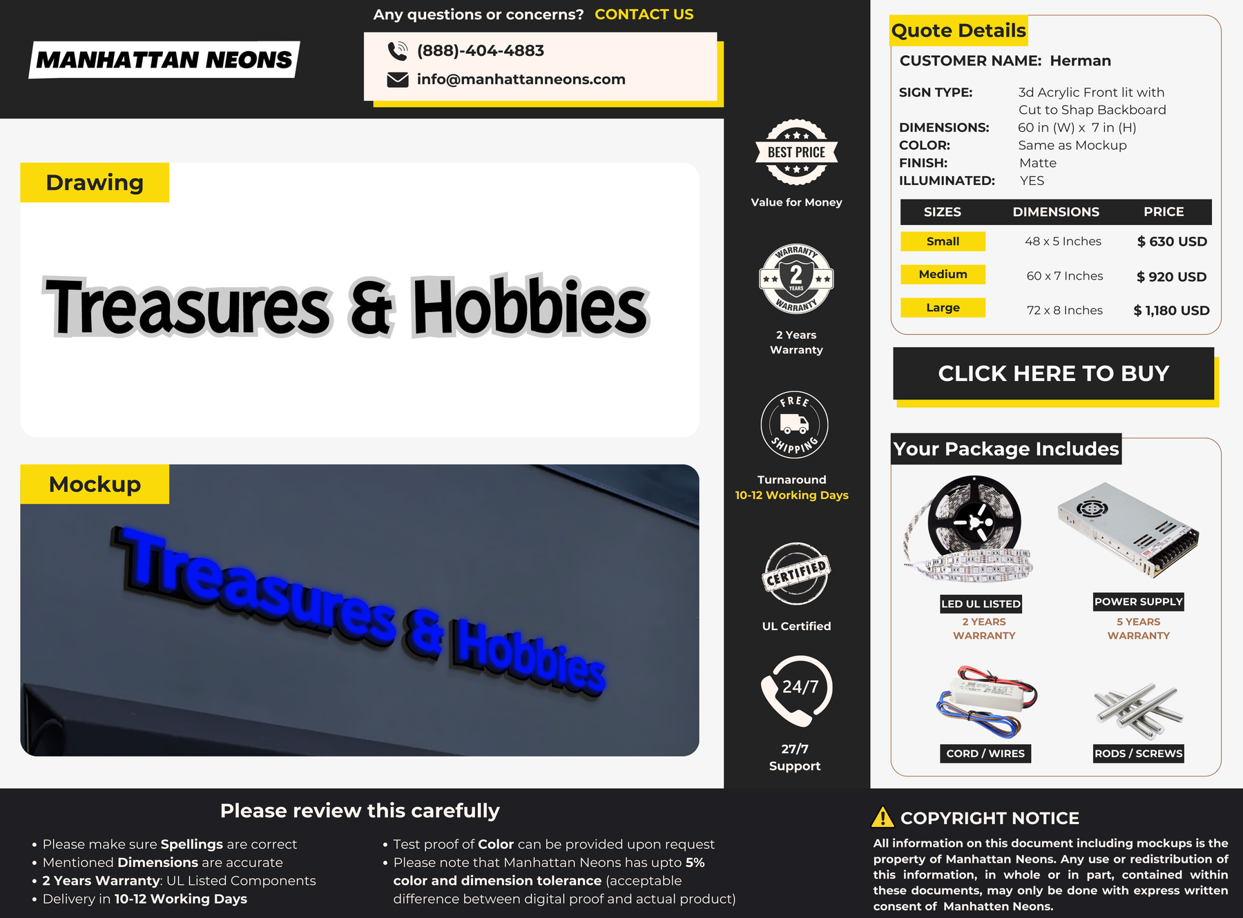 We offer 5 Years Warranty on all our neon signs. We care for all our customers to have a happy experience