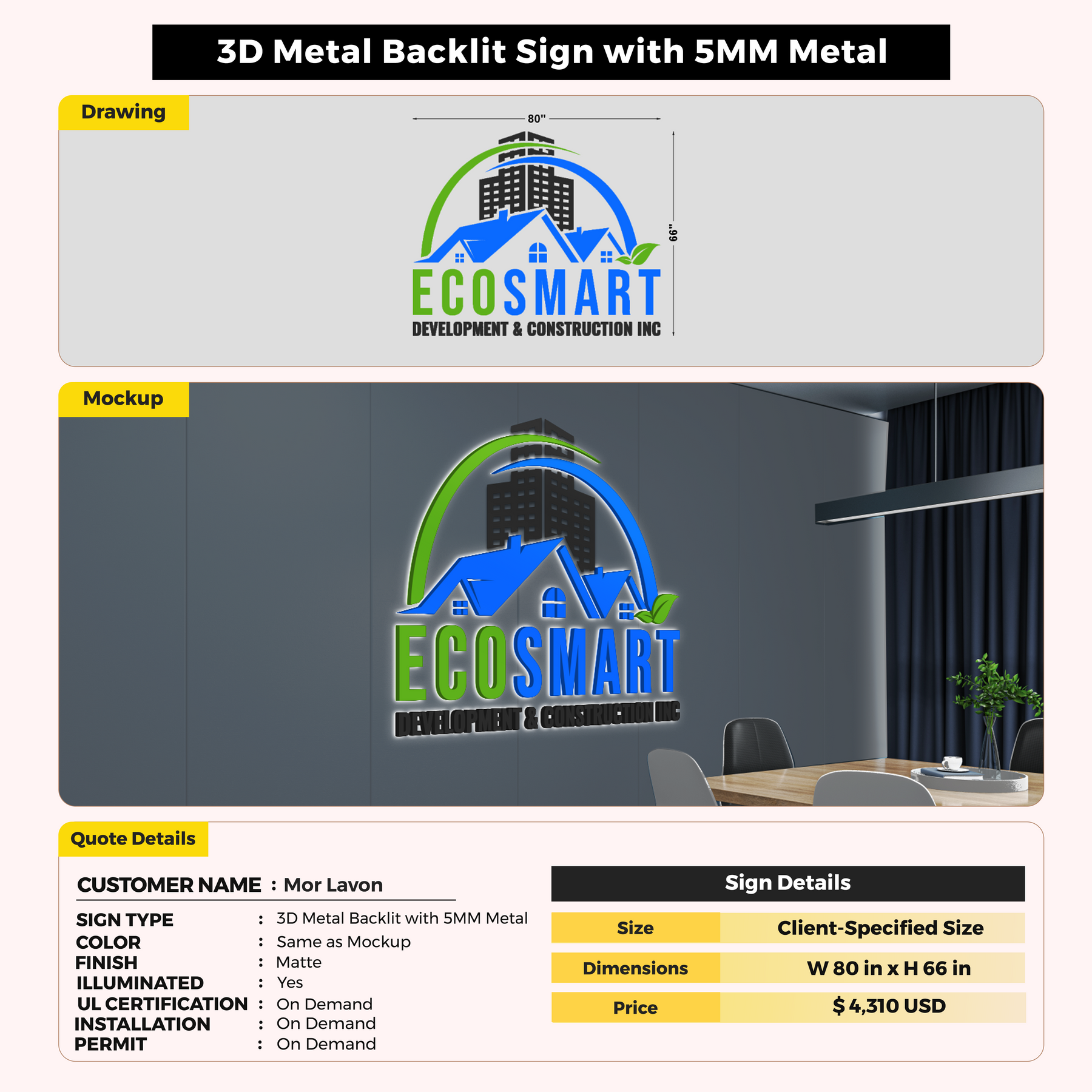 3D Metal Backlit with 5MM Metal Sign For Mor Lavon