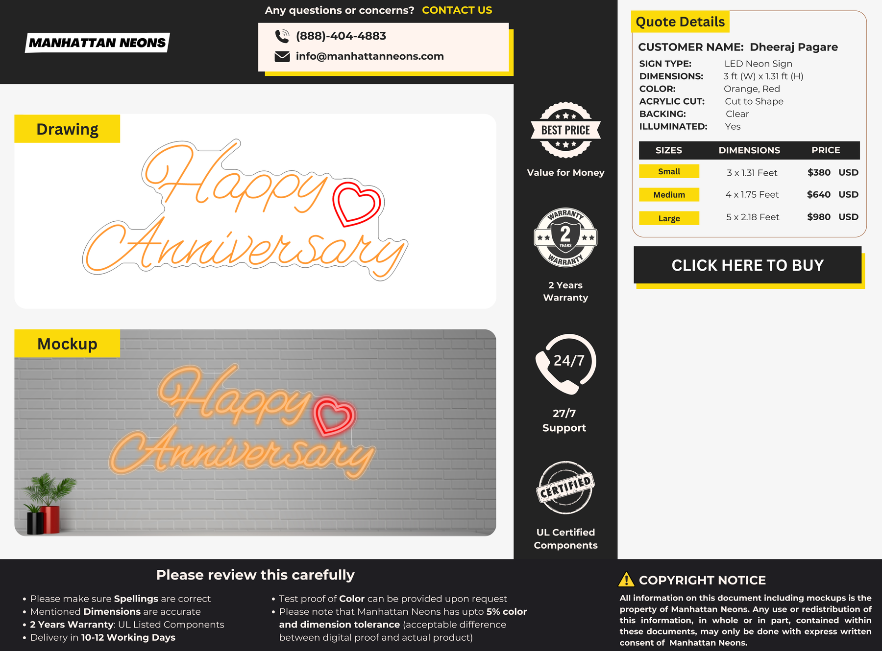 We offer 5 Years Warranty on all our neon signs. We care for all our customers to have a happy experience