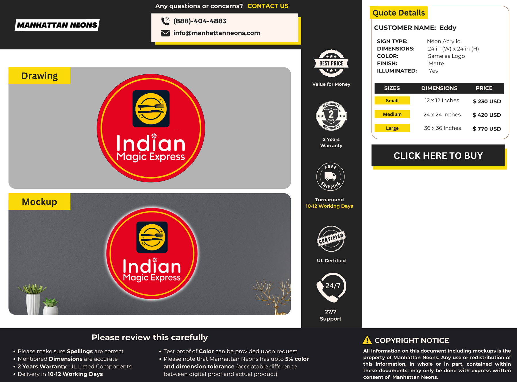 We offer 5 Years Warranty on all our neon signs. We care for all our customers to have a happy experience