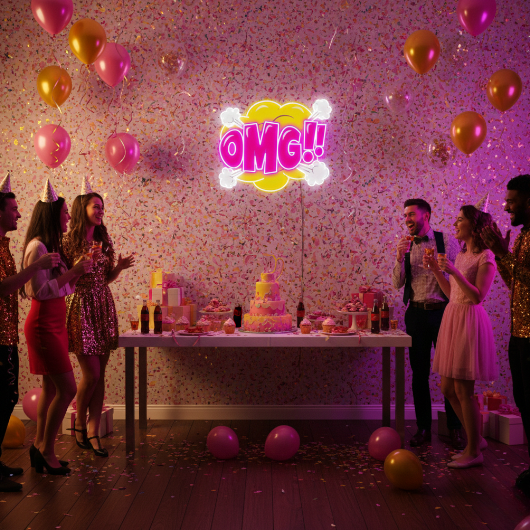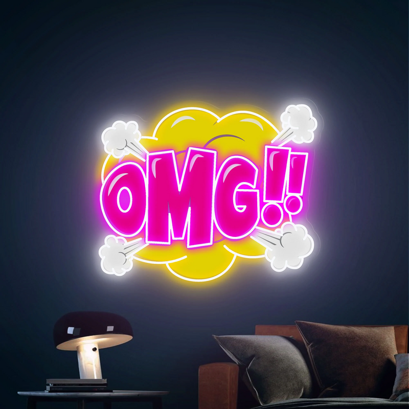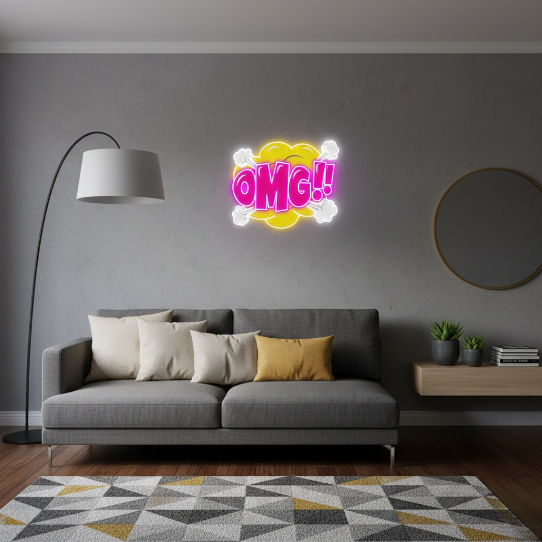 Make a bold statement with the OMG UV Printed Neon Sign by Neon.Shop. Featuring eye-catching “OMG” lettering enhanced with high-quality UV printing and vibrant LED neon illumination, this sign adds energy, attitude, and modern style to any space.
