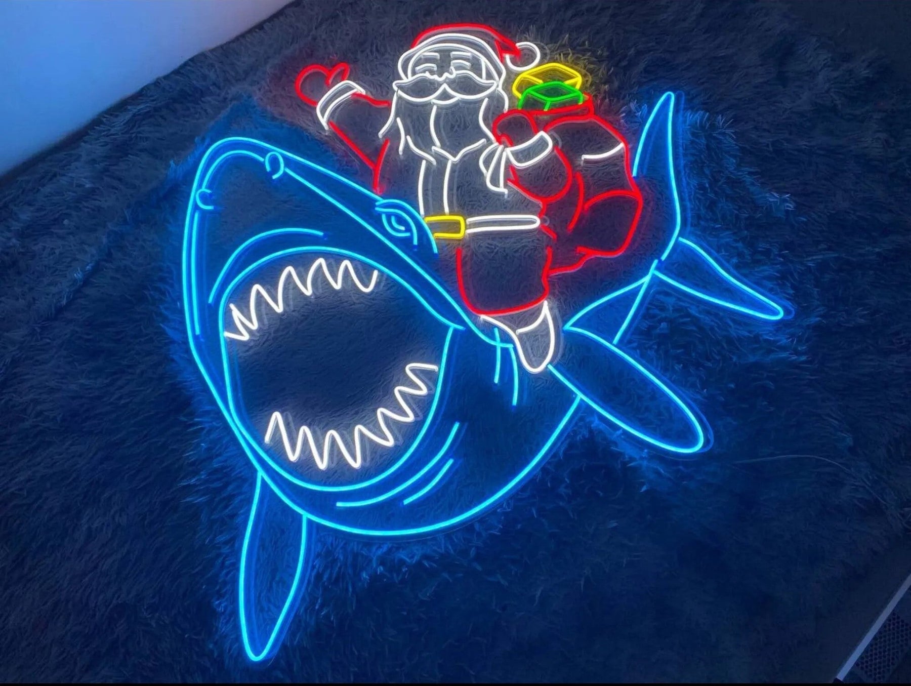 Crafted with premium LED neon tubing, it offers long-lasting brightness, safe low-heat operation, and energy-efficient performance. Add a splash of humor and holiday adventure to your space with this one-of-a-kind Santa-on-a-Shark neon sign exclusively at Neon.Shop.